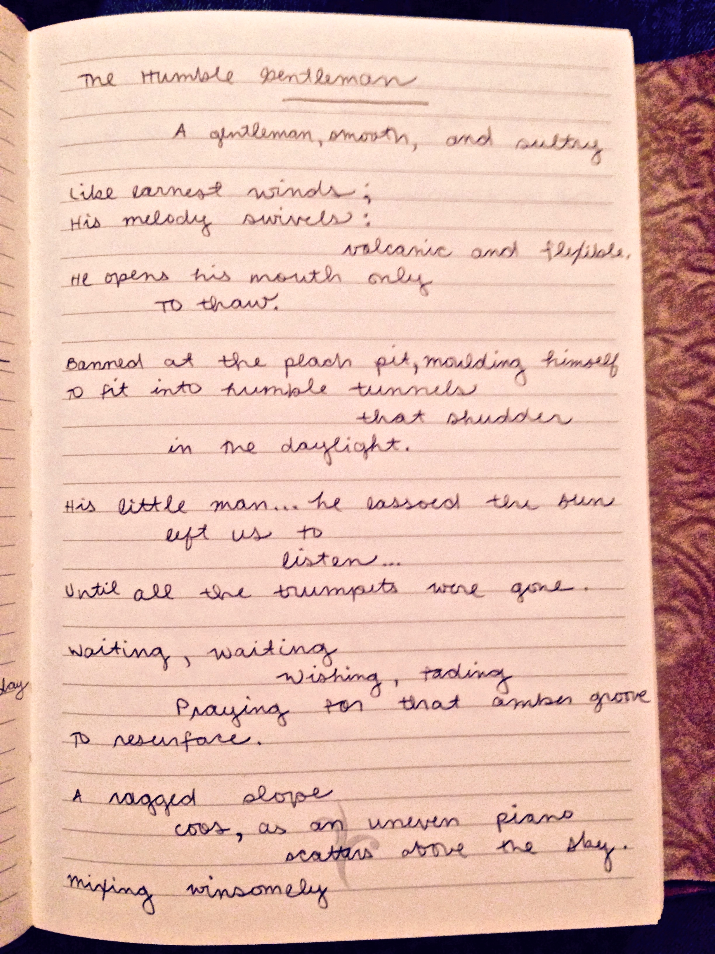 A gentleman, smooth, and sultry like earnest winds; his melody swivels: volcanic and flexible. He opens his mouth only to thaw. Banned at the peach pit, molding himself to fit into humble tunnels that shudder in the daylight. His little man…he lassoed the sun. Left us to listen…until all the trumpets were gone. Waiting, waiting. Wishing, fading. Praying for that amber groove to resurface. A ragged slope coos, as an uneven piano scatters above the sky. Mixing winsomely, a drink, gated by white ice and black straws. The gentleman offers you his smile.