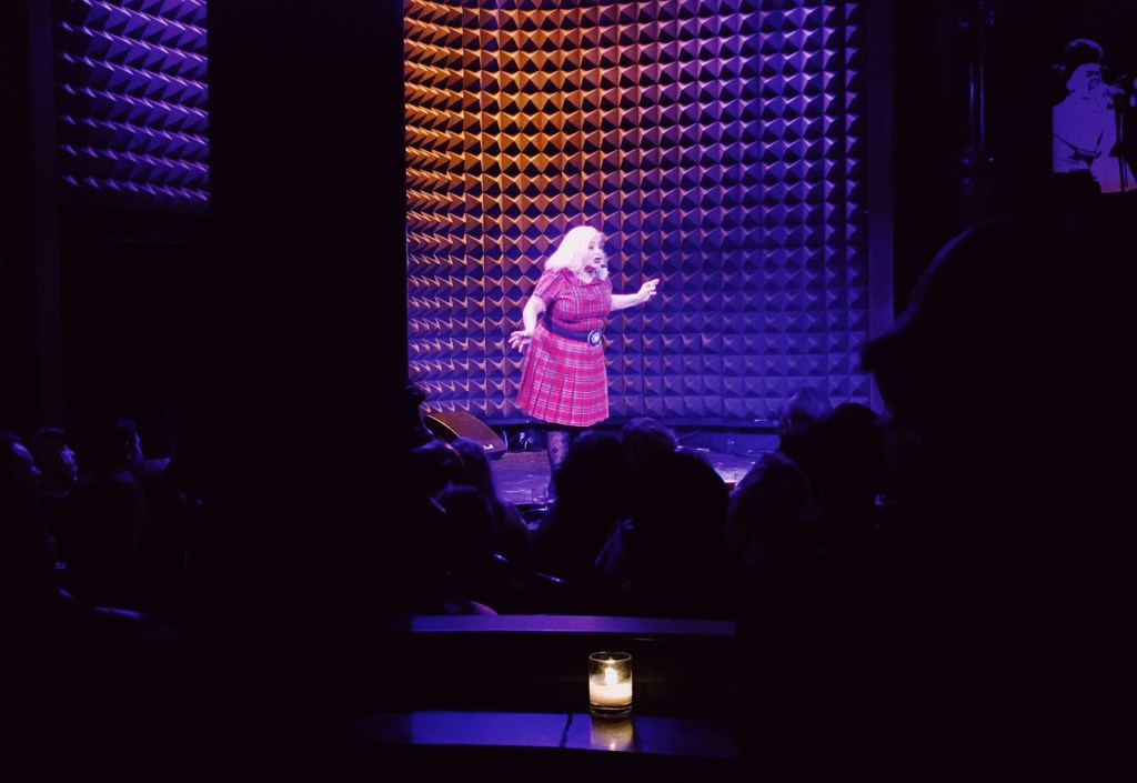 At a table at Joe’s Pub, with expensive cocktails and a two drink minimum, and two East Village natives stuck sitting with a view obstructed by pillars.
